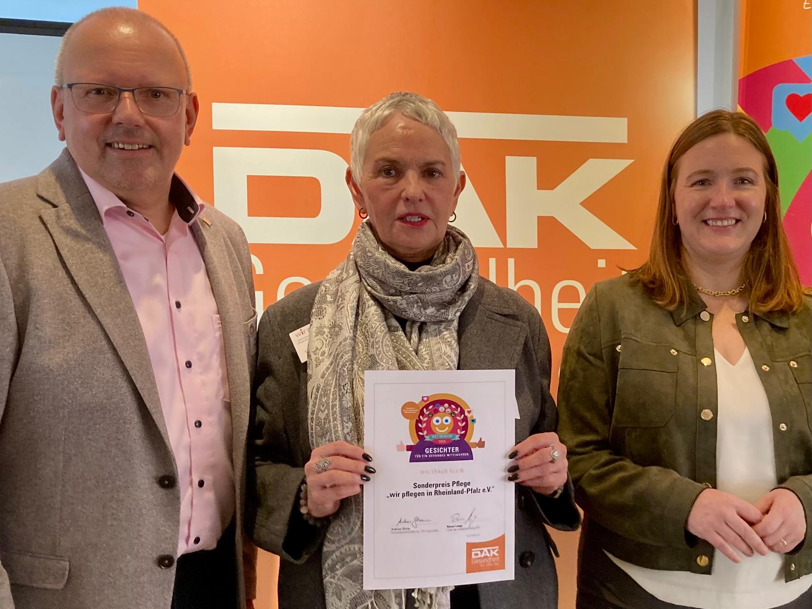 Waltraud Klein aus Mayen hat für den neugegründeten Verein „Wir pflegen Rheinland-Pfalz“ den Sonderpreis Pflege beim Wettbewerb „Gesichter für ein gesundes Miteinander“ der DAK Gesundheit Rheinland-Pfalz in Mainz -im Beisein von der Schirmherrin Familienministerin Katharina Binz- entgegengenommen.